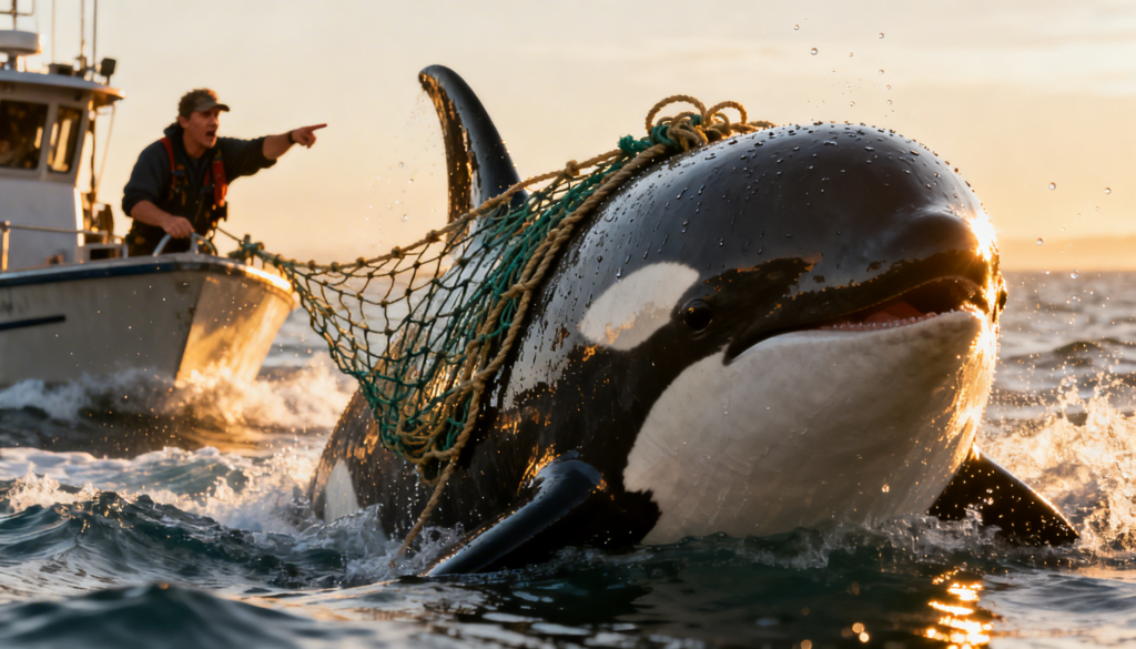 As the orca surfaced once more, the sunlight hit its back at just the right angle. The captain’s grip tightened on the railing.