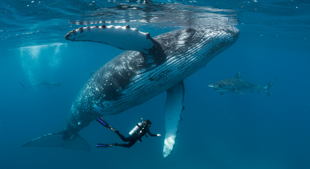 Just as the shark accelerated, the humpback whale responded with incredible agility. It tucked Nan under its massive pectoral fin—an appendage the size of a small car—and shielded her entirely from the shark’s view.