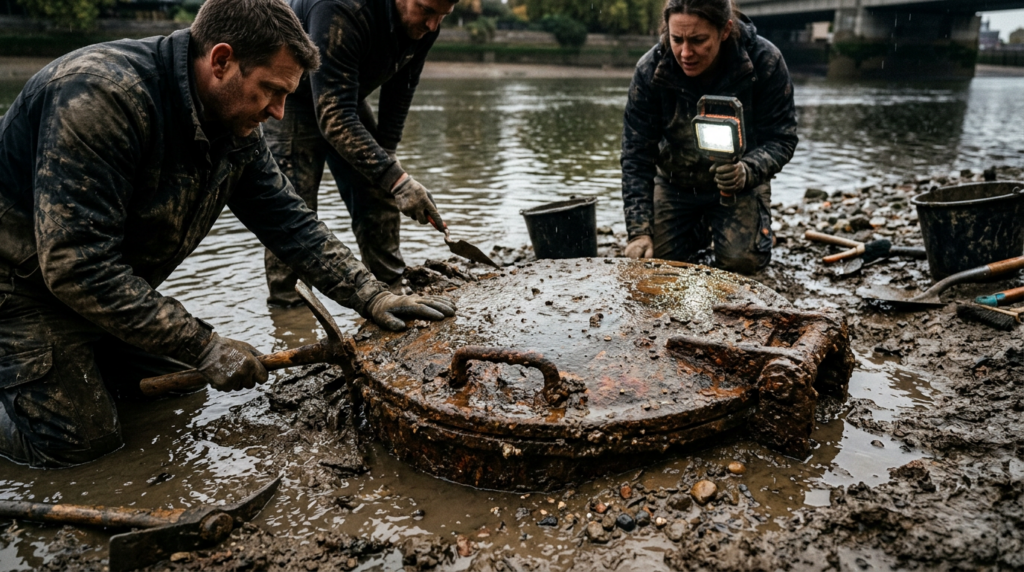 The hiker surfaced, gasping for air. He told the fisherman that the object was a heavy metal plate, nearly hidden by decades of silt and mineral deposits.