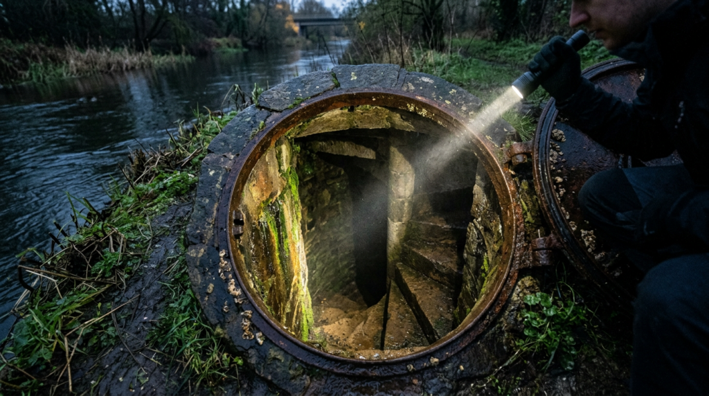 A set of rusted spiral stairs descended into the darkness beneath the river. A strange, metallic smell drifted up, preserved for decades.
