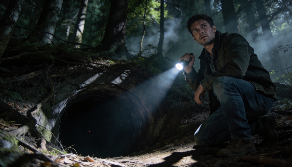 He returned with a flashlight, its beam cutting through the thick, heavy darkness of the shaft. As he stepped inside, the silence of the mine was absolute, broken only by the sound of his own breathing and the crunch of gravel under his boots.