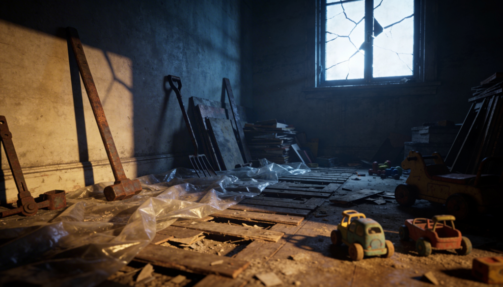 In the newer section of the estate, the Victorian charm gave way to mid-century modern design. Here, the items were different—children’s toys were scattered across the floor, and some areas looked as if a renovation had started and then abruptly stopped.