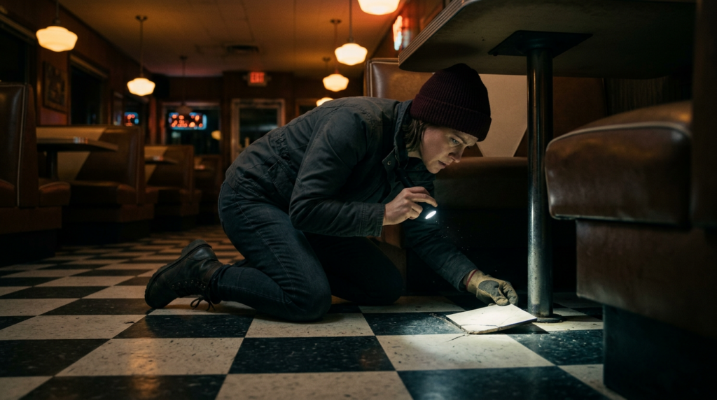 Maggie knelt on the cold linoleum floor. The diner was empty, the late-night silence pressing against her ears. She pressed her fingers against the edge of the loose tile.